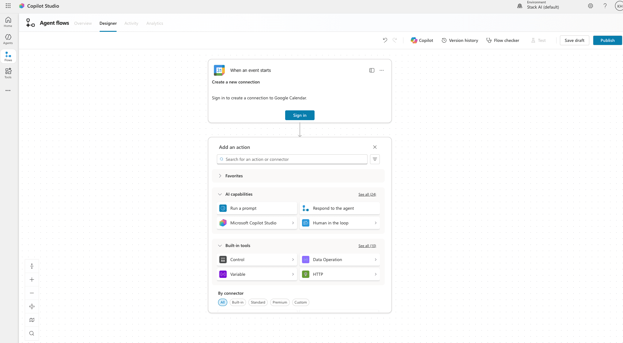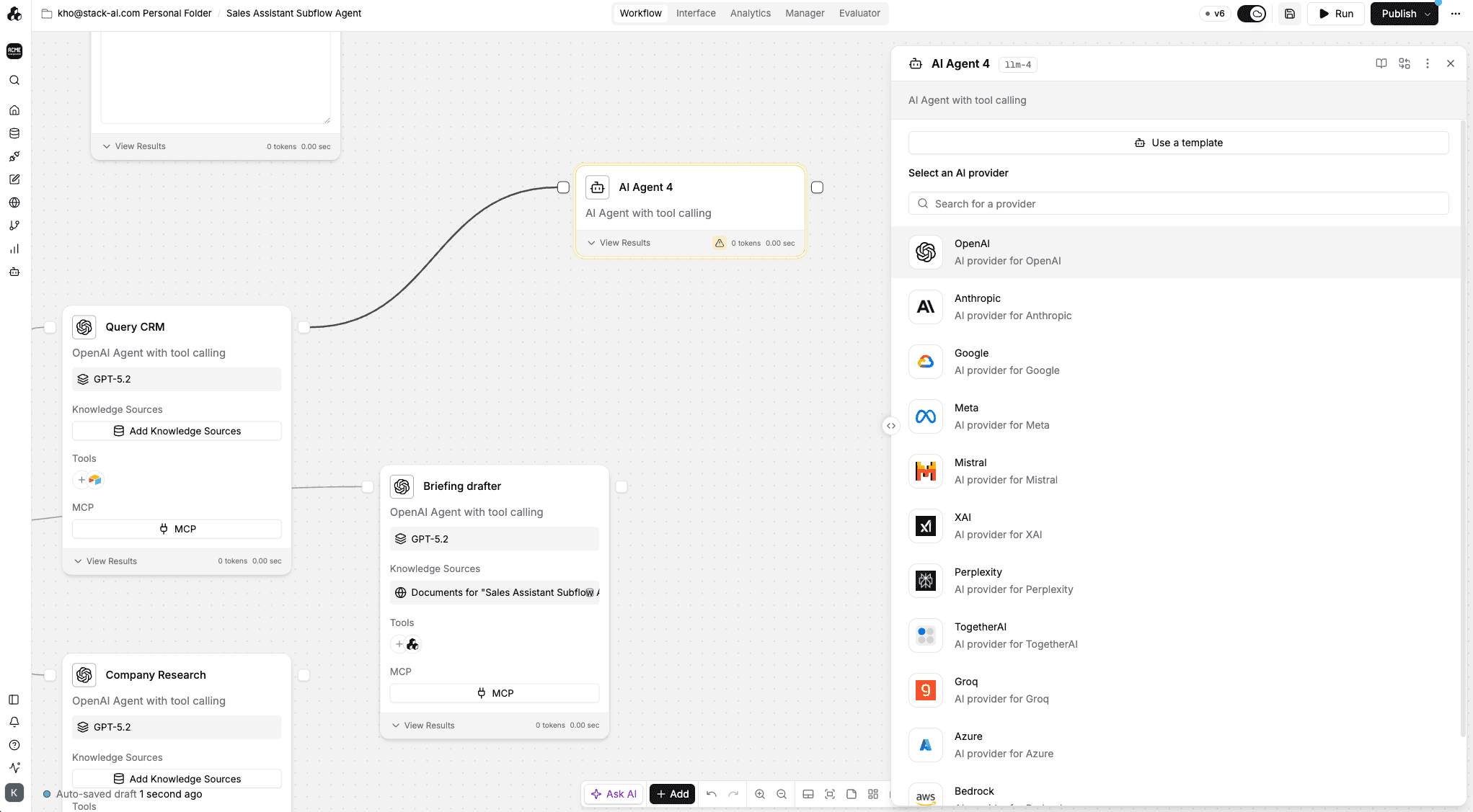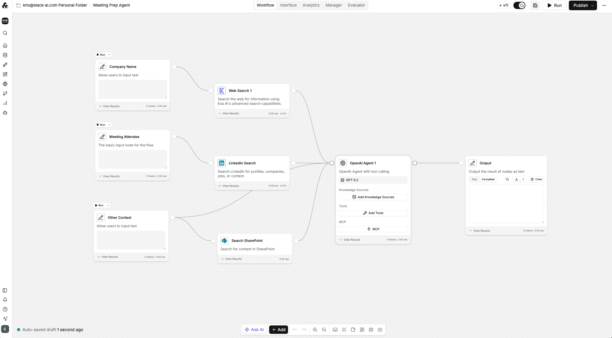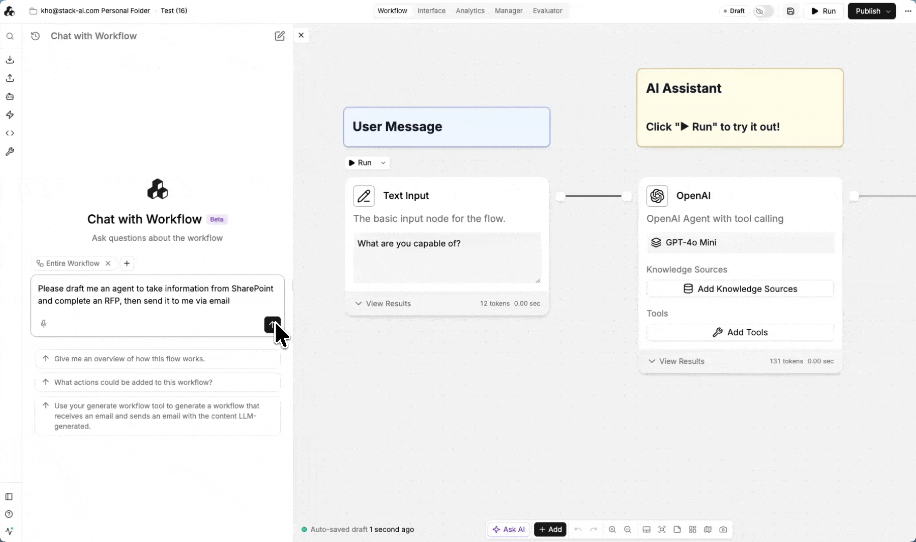 StackAI also offers seamless AI-assisted building via the Auto Agents Suite that can help jump-start projects by drafting complete workflows, including connections to SharePoint, Email, and other tools.