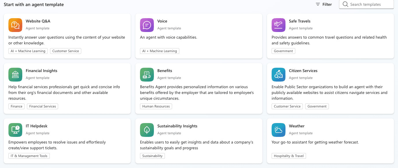 Creating basic chatbots grounded on publicly available websites or previously-uploaded Microsoft-hosted knowledge, with the capacity of triggering actions in other systems if it detects the appropriate intent when chatting. See below for examples of featured templates, all of which are simple chatbots over available information: